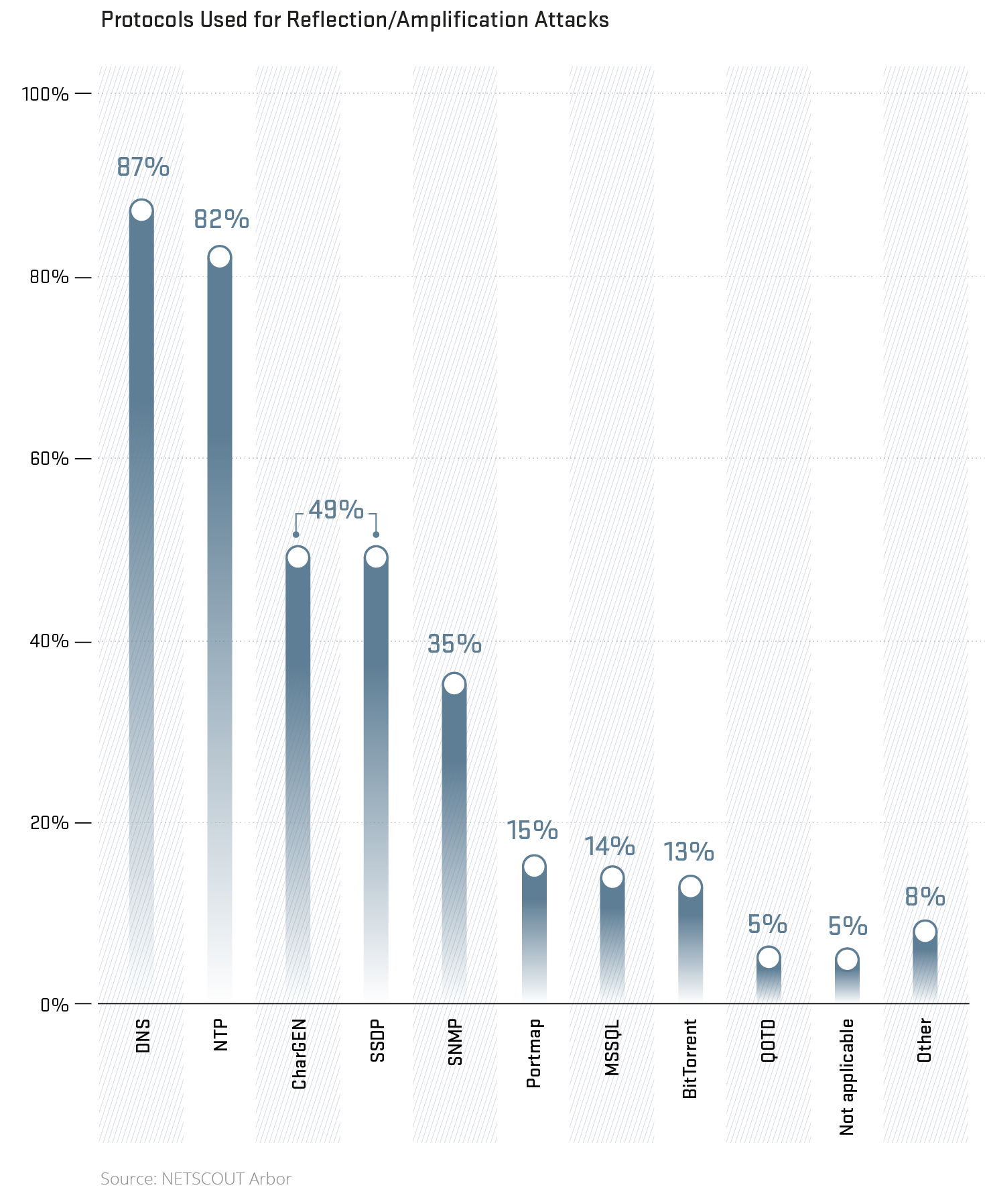 - NTP was used in 14% of DDoS events overall but 56% of events over 10 GB/sec and 84.7% of events over 100 GB/sec
