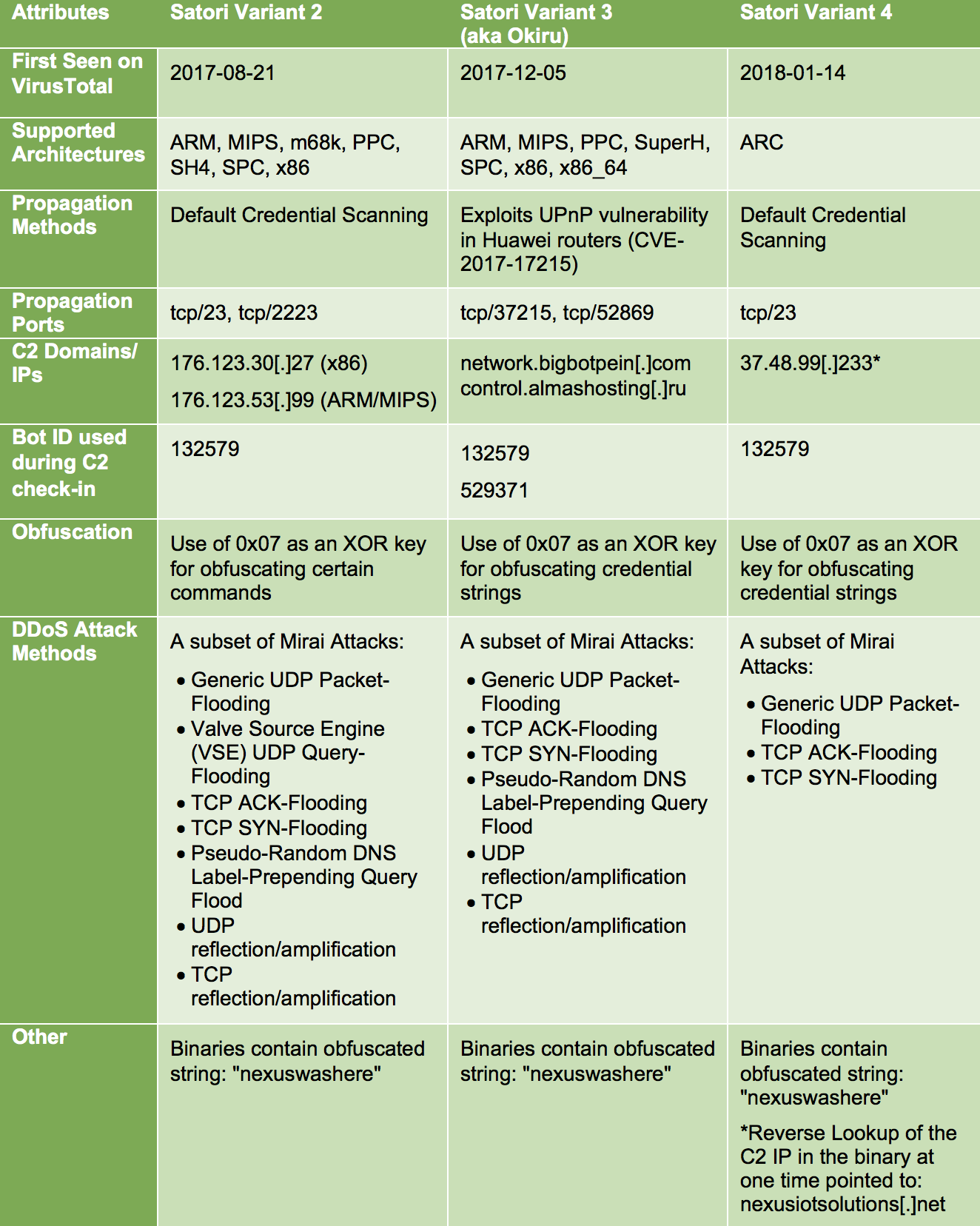 Researchers first discovered Satori in December 2017 and other versions of it have been identified since. The initially discovered version of Satori distinguished itself from Mirai in that its propagation method targeted two vulnerabilities in IOT devices – a "zero-day" in Huawei's home gateway and a previously-known command execution vulnerability in Realtek's UPNP SOAP interface. Both were clearly intended to target two very specific types of devices, unlike the more agnostic Mirai, which would infect any device with a default or easily guessable telnet username and password. Although there is evidence Satori re-used at least some of the public Mirai code, its precise targeting was what caught the eye of researchers. To perhaps further muddy the waters, other versions of Satori do indeed use telnet to propagate, but with a more sophisticated list of usernames and passwords. Every IOT malware including Satori is delivered to a victim in a compiled, ready-to-run format. That means a Linux executable compiled specifically for the architecture of the victim. For instance – an ARM device cannot run an executable compiled for x86 processors. Before delivering its payload, both Mirai and Satori poke and prod the victim to determine which pre-compiled version of the Mirai binary to download and execute. Satori raised the bar by introducing new architectures – superh and ARC. It's unclear whether the actors behind Satori did this because they knew a vulnerable population existed, or only hoped that it did. Below is a chart showing the similarities and differences, based on ASERT analysis, between the three most recent variants of Satori. Complementary information, including additional IoC's, can be found in [1]-[5]. Variant 1 is not included due to its lack of functionality as discussed in [1].