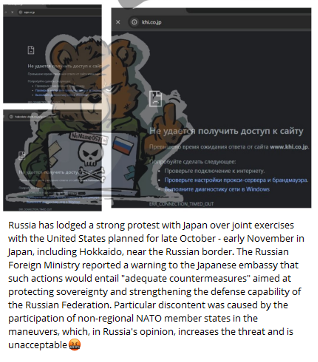 On October 11, 2024, the Ministry of Foreign Affairs of the Russian Federation (MID) published an interview expressing concern over Japan's increasing militarization, particularly its rising defense budget, development of pre-emptive strike capabilities, and involvement in US-led military exercises and joint ballistic missile-defense research and cooperation [1]. In support of these concerns, two pro-Russian threat actors - NoName057(16) and the Russian Cyber Army Team - launched a series of high-impact DDoS attacks three days later, on October 14-16, 2024. The slight delay occurred because NoName057(16) had recently been focused on attempting to disrupt the Belgian elections which took place over the previous weekend--this included more than 30 configuration updates sent with near exclusive Belgium targets for government, logistics, and election sites. This incident underscores the coordination between these two threat actors as we have observed on multiple occasions [2,3,4].