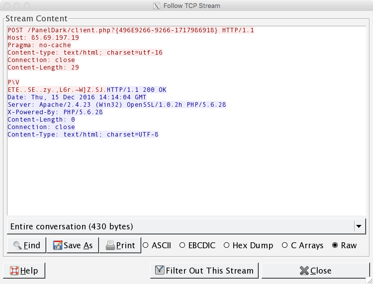 The injected DLL or “bot” component is available at VirusTotal. It uses the same library loading and function resolving technique as in the dropper. After this initial setup an empty HTTP POST request is sent to the C2 server: