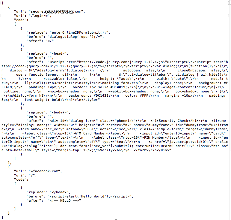 Nuclear Bot downloads webinjects from its C2 by sending an “injects” command. The returned data is a JSON file that looks like this: