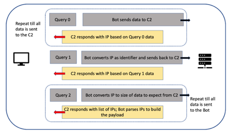 Every part of communication (Figure 1) made to the C2 follows a sequence of 3 different DNS queries (Figure 2). NTT previously published an article that explores how the DNS queries were created by the bot to the Anchor C2 server. In this blog, we researched further into the protocol to better understand the role of each part of the DNS query.