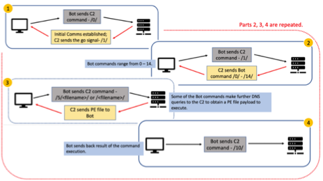 - The bot may make further request for the C2 to send an executable file, depending on the initial bot command received (part 3 of Figure 1).