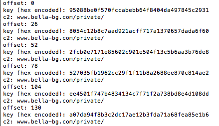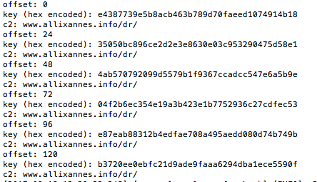 Iterating through the possible C2 offsets and keys for the analyzed sample we get: