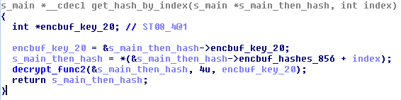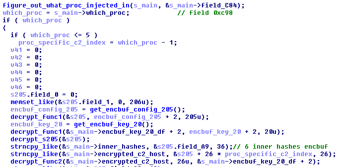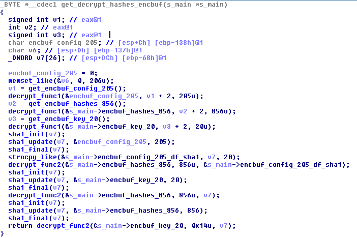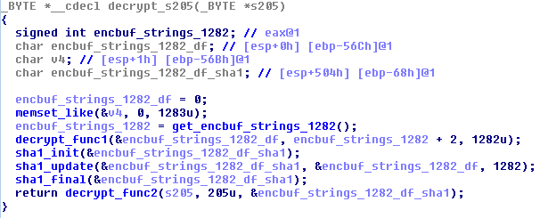 Note: in the “Windows API Calls” section above we mentioned that six of the hashes were stored in a separate encbuf. In the screenshot above, we’ve made a comment where this encbuf comes from. The “decrypt_s205” function contains more decryption: