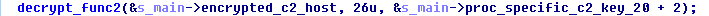 At this point, the config encbuf is decrypted, but the C2s are still obfuscated. Note that up to six C2s can be referenced depending on which process FormBook is running in. The final step is one more round of decryption using the process specific key from the first step: