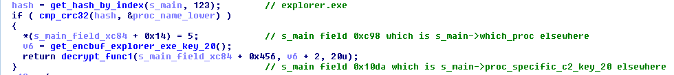 }A particular string is referenced by an index number and is decrypted using decrypt_func2: A listing of the decrypted strings and their indexes are available on GitHub. Command and Control (C2) URLs The C2 URLs are stored in a “config” encbuf and the mechanism to get at them are convoluted and spread out over multiple functions. The first step of the mechanism is to figure out what process the injected FormBook code is running in. Depending on the injected process, a C2 index is saved and a 20-byte key is extracted from an encbuf and decrypted. Here is the snippet of code for when FormBook is running in explorer.exe: