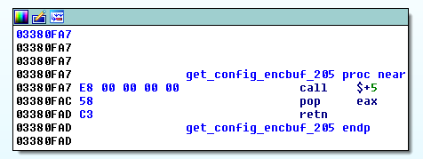Let us start with three building blocks that will be used in later sections. First, most of FormBook’s data is stored encrypted in various locations--we’ll call these “encbufs”. Encbufs vary in size and are referenced with functions similar to this: