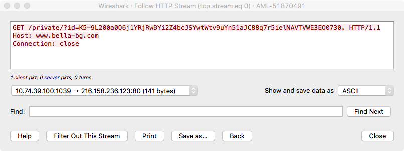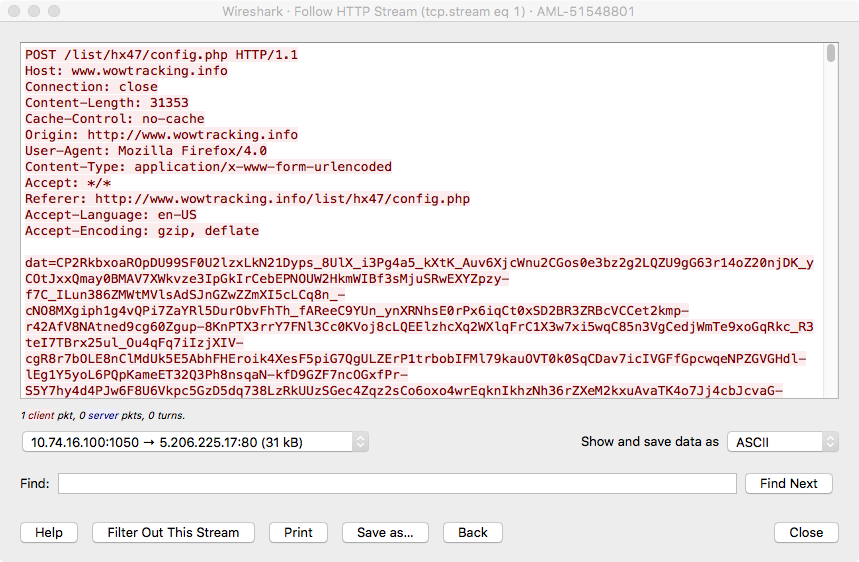 Digging further into this, we noticed that starting in this version there were additional encrypted strings. These can be seen in this listing on GitHub. In particular starting at index 78 there are 64 seemly random domains (including the ones seen in our sandbox run). Tracing these strings in the code we see that 15 of these are randomly selected into an array and then one of them is randomly replaced with the C2 from the config encbuf. At a quick glance there doesn’t seem to be any overlap of these domains from sample to sample. They all seem to be registered, but by different entities. Some of them show up in search engines with benign looking data, but most return HTTP “page not found”s. For now, our theory is that these are randomly chosen decoy C2s. C2 Communications FormBook uses HTTP—both GETs and POSTs—for C2. An example of the initial phone home looks like this: