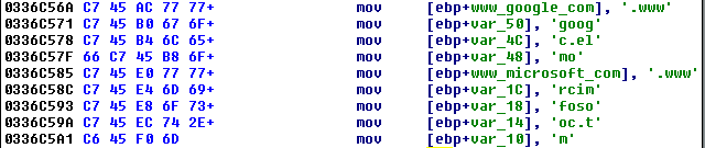 Strings Strings are obfuscated in two ways. Some of them are built a DWORD at a time on the stack: