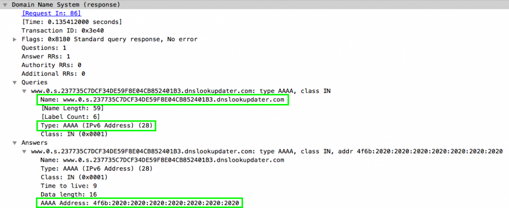 All data sent between the bot and the C2 is done using AAAA DNS UDP queries. Data to the C2 is via specially crafted query names and data from the C2 is returned via IPv6 addresses. The bot side of the connection drives all communications. An example query and response looks like this: