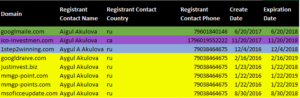 In the prior section we associated the first domain with s.miloshevich[@]yandex.ru. The actor behind innaput69[@]gmail.com registered domains two and three. All three domains hosted either a variant or the primary sample we analyzed, thus tying them together as part of the same activity. Looking at the domains registered by innaput69[@]gmail.com, the names on the account use the same last name but use two different first names. Notice all but one list the registrant contact country as RU.
