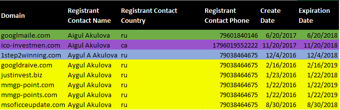 Pivoting off of the phone number for "Aygul A Akulova" in figure 3 we find another email address, jemesn[@]mail.ru. This email address is tied to a couple of other domains as well.