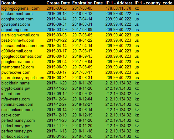 All of these domains are tied to the email address s.miloshevich[@]yandex.ru with the registration name Slabodan Miloshevich. Each of the domains used Kazakhstan as the registrant's country. Additional domains registered by the same entity resolved to 4 distinct IP addresses (as of March 24. 2017).