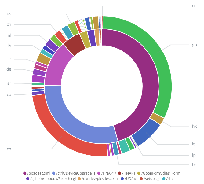 Fig 1: IoT Exploits Our data shows a range of new and old exploits being used to target IoT devices. As we talked about in Regifting Exploits, shelf life for an IoT based exploits can last for years. CVE-2014-8361 is just one such example. Digging further into our dataset we can see which countries are likely to exploit certain vulnerabilities. Fig 2 shows a donut chart of exploit attempts from December 2018 on the inner ring, and the country of origin on the outer ring. We can see exploits originating from the United Kingdom tend to favor the use of the Realtek SDK Miniigd Command Execution (CVE-2014-8361) exploit. We're also able to drill down and see only 10 unique sources were used for these attacks. This may indicate that the 10 source IP addresses are in the same botnet.