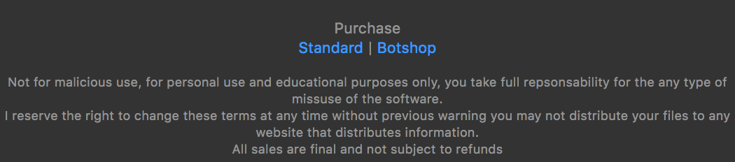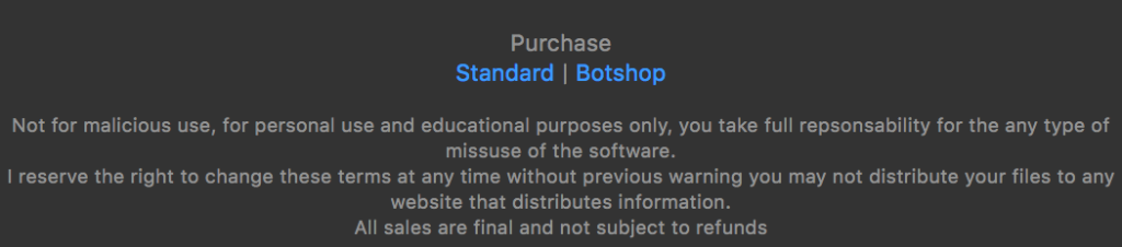 Figure 2: Kardon Loader Pricing[/caption] The actor provides a disclaimer stating this software should not be used for malicious purposes (Figure 3).