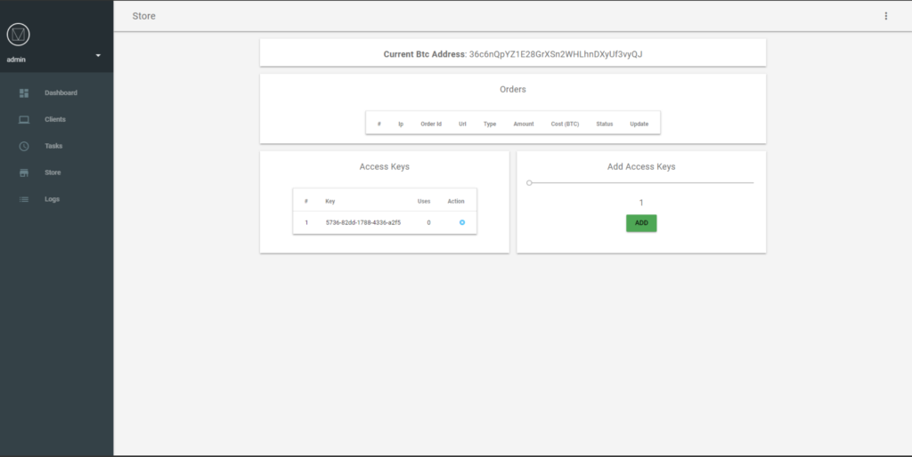 The panel for Kardon Loader incorporates a simple design with a dashboard of the bot distribution and install statistics. A notable feature of this panel is the bot store functionality allowing the bot admin to generate access keys to customers that would give them the ability to execute tasks based on the predefined parameters (Figure 8).