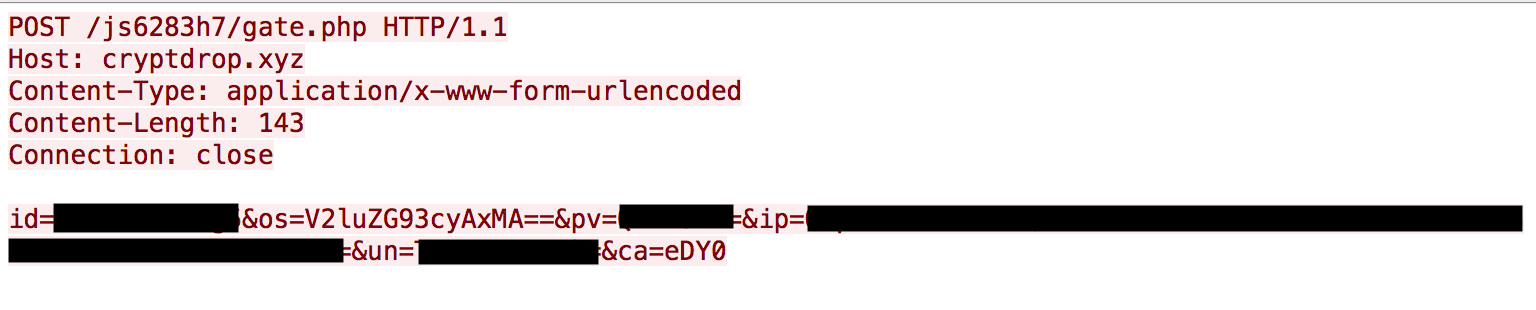 Next, the infected host will send a confirmation message back to the C2 in the same format as the initial post payload with the following additional fields: