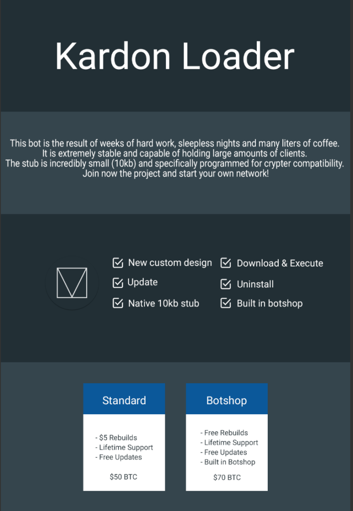 This article is an overview of the downloader malware known as Kardon Loader. Kardon Loader is a fully featured downloader, enabling the download and installation of other malware, eg. banking trojans/credential theft etc. Downloaders are a critical part of the malware ecosystem, often developed by specialists and sold independently of the trojan that is the objective of the campaign. Although only in public beta stage this malware features bot store functionality allowing purchasers to open up their own botshop with this platform. The actor started advertising this loader in late April and has communicated further development will do done on this loader in the future, including encrypted C2 communications.