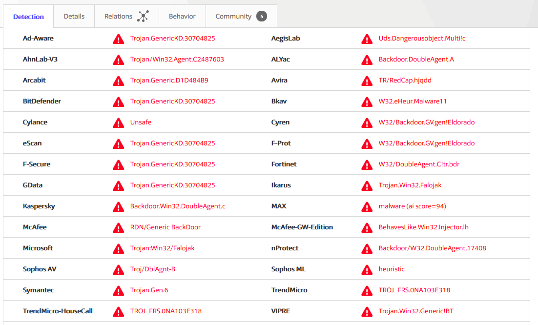 - May 3, 2018 – After the disclosure of the malicious Lojack binaries, many Anti-Virus vendors have been quick to respond in properly marking samples as "malware" and "DoubleAgent", rather than "Riskware" or "unsafe" (Figure 2).