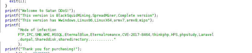 While searching for additional samples related to Lucifer, we discovered a Linux version. The Linux version we discovered was x86-64 based, statically linked, and was not stripped if its symbols. Reviewing the Linux version, we see the same “welcome” message (Figure 3) as its Windows counterpart, further indicating its relationship to the Windows variant. The Linux version of Lucifer uses the same C2 domain as the Windows version 2, but its connection is on a 15888/TCP, which was used in the Windows version 1.