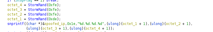 Several of the TCP- and UDP-based attacks use the same routine to create the spoofed source IP address. Figure 5 is a code snippet showing how this is done in the SYNFlood function.