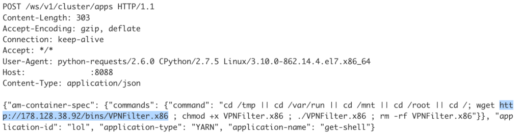 Let’s focus on a Mirai variant that calls itself “VPNFilter” (2bcca8ac8d4d80f6740ef14d521284c0, Fig 5), even though it has nothing to do with the more advanced IoT bot. Across our honeypot network, we saw this exploit being delivered by two source addresses on Nov 16 - 185.244.25.241 and 104.248.170.199. The command-and-control site for this bot is the same IP address that hosts the binary. This particular variant differs from an IoT Mirai in an important way - it only delivers the x86 version of the bot. IoT Mirai variants will poke around a potential victim in order to deliver an executable that’s suitable for its CPU architecture – x86, x64, ARM, MIPS, ARC, etc. This version assumes the Hadoop YARN service is running on a commodity x86 Linux server. When running the “VPNFilter” variant in a sandbox, we immediately noticed it still tries to brute-force factory default usernames and passwords via telnet. If it successfully finds a vulnerable device, instead of directly installing the malware on the victim, it reports the IP address, username, and password to a reporting server, where the attacker can automate the installation of the bot.