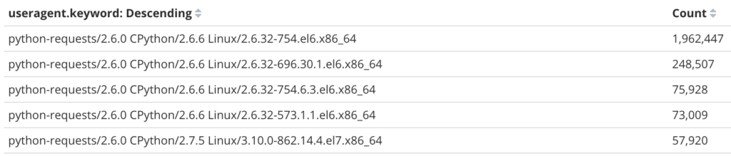 If we look at the top 5 User-Agents delivering these exploits in Fig 3, we can see the attackers using the Python requests library to deliver the HTTP payload.