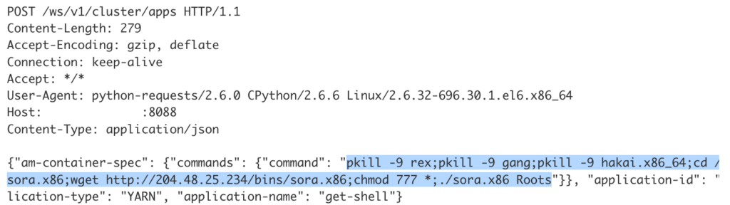 Fig 3: The huge number of exploit attempts, coming from a small number of sources, coupled with the fact that none of the malware payloads we’ve seen try to propagate in a worm-able fashion using the Hadoop YARN exploit, and none of the payloads are written in Python, leads us to speculate that a small number of attackers are manually scanning the Internet to exploit this vulnerability. The exploit payloads we’ve seen, as shown in Fig 4, are all functionality identical – pull down a malware binary from a URL and execute it.