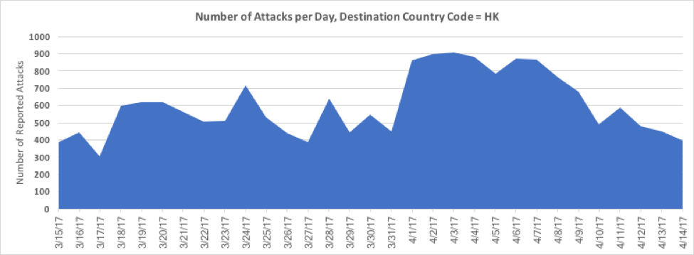 DDoS Statistics from ASERT's Weekly Threat Bulletin of March 23rd.[/caption] Normally, week after week, you can count on the U.S. being the top destination country for DDoS attacks. However, recently we observed a bit of an anomaly. For the two weeks ending April 6th and April 13th, Hong Kong was the top destination country for attacks greater than 10 Gbps in size: [caption id="attachment_8949" align="aligncenter" width="650"]