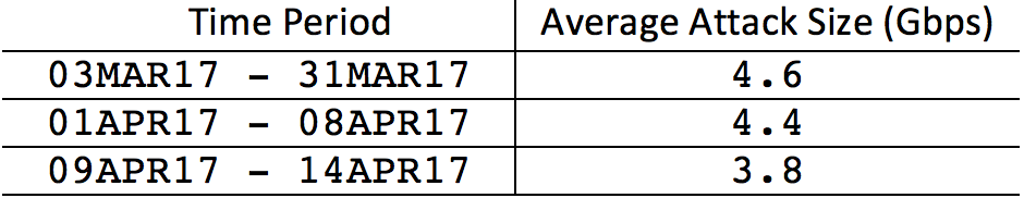 In short, the first 8 days in April saw a 67% increase in the number of attacks compared to "normal" (where normal, in this case, is defined by attack data from the prior 29 days and the following 6 days). The following table illustrates that the average attack size did not significantly deviate during the April 1st through April 8th timeframe.
