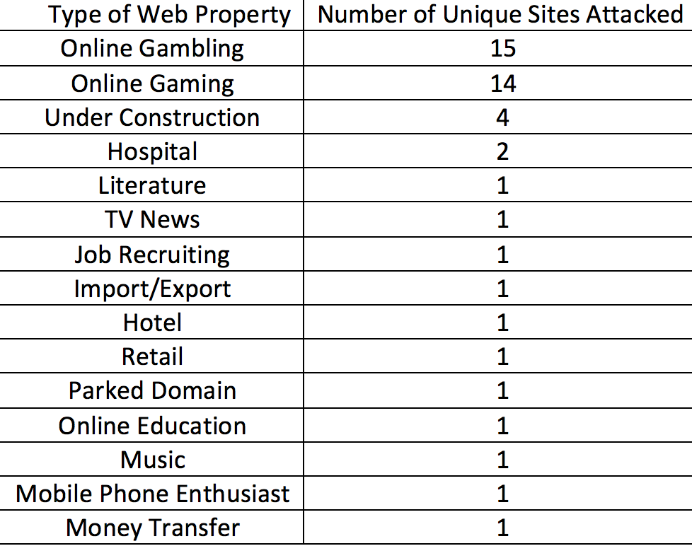 Nodal Analysis of Target IPs to Domains. Note the lack of Clustering.[/caption] Again, the targets are highly scattered encompassing over 500 different domains so we looked at the domains for target IP addresses that were hosting only one domain. There were 94 such cases. Of those it was possible to roughly classify half as follows: [caption id="attachment_8939" align="aligncenter" width="529"]