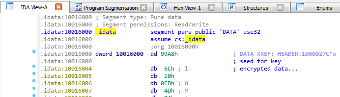 A static config is stored encrypted in a PE section of the DLL--so far, we’ve seen two names for this section: .idata and .xdata.: