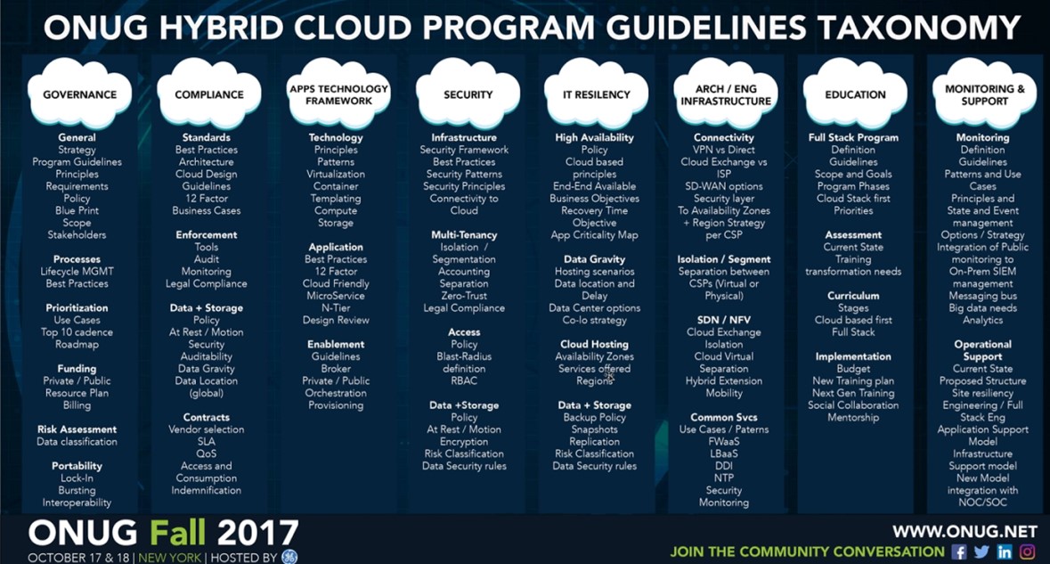 Cloud adoption is maturing before our eyes. And, Regardless who’s Cloud Maturity Model (CMM) one considers, the key gates can be summarized into Planning (inclusive of architecture, workforces, cost, governance, management, security, risk & compliance), Implementation (inclusive of monitoring and security), and Optimization (inclusive of cost). Our own ONUG Hybrid Multi-Cloud (HMC) working group published the following cloud adoption framework last year.