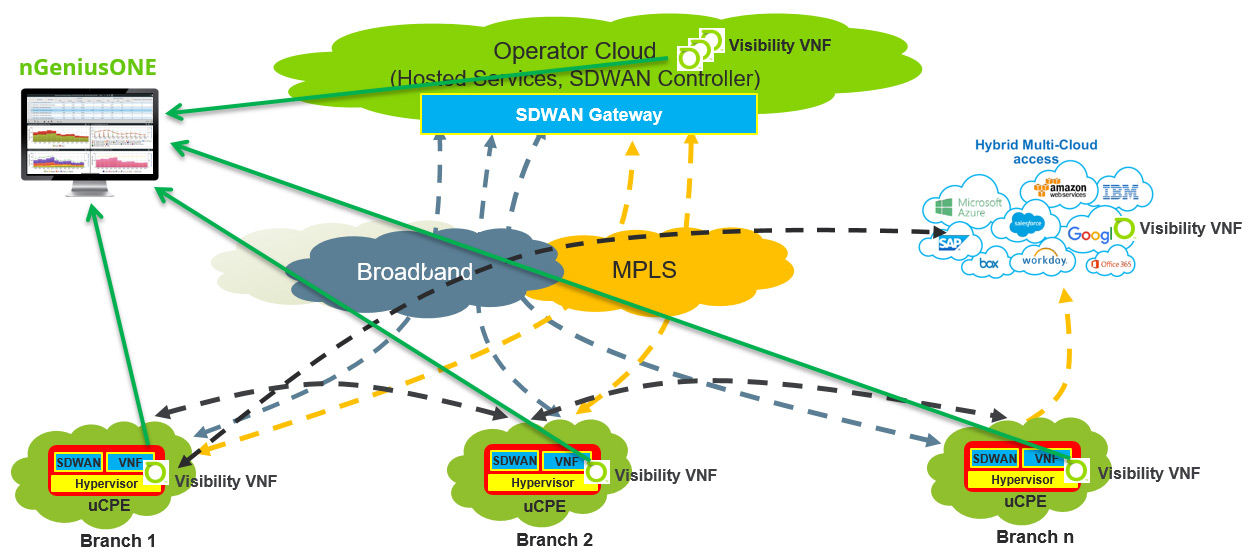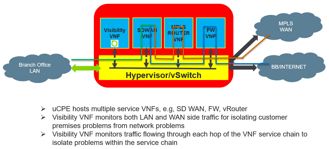 The graphic below demonstrates how service providers will deploy uCPE VNFs. These VNFs will form a service chain under the hypervisor. What changes here is that now the network interaction between the edge firewall, load balancer, MPLS router, and SD-WAN will take place across the uCPE’s vSwitch. This in turn creates the next monitoring and operational support challenge: lack of hop-by-hop visibility.