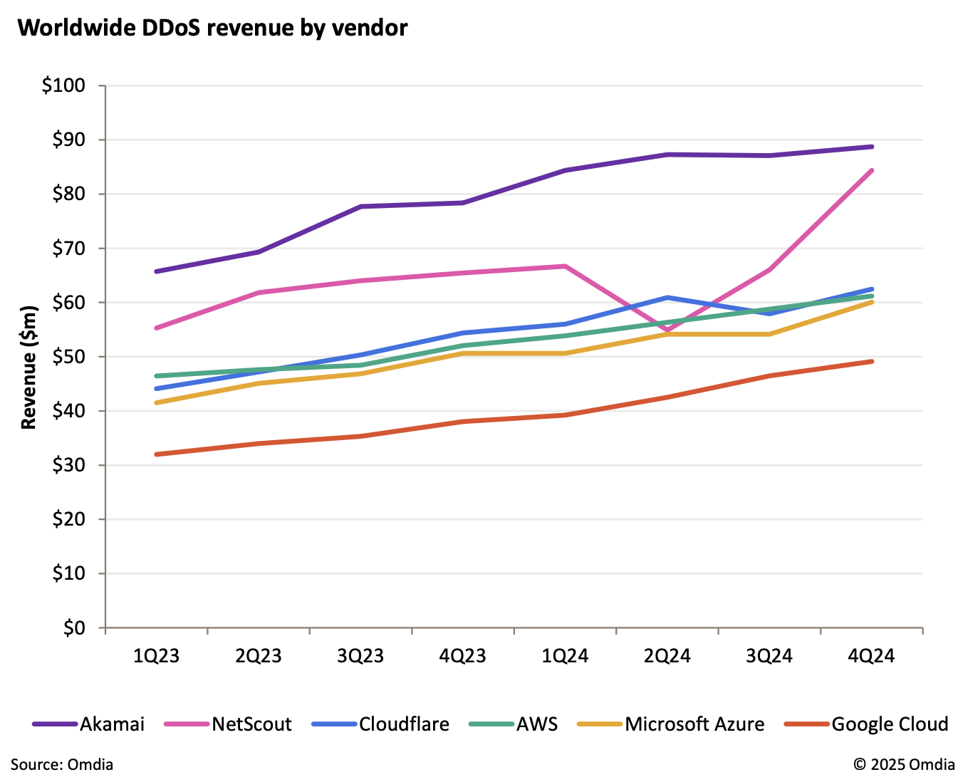 The top five DDoS prevention technology vendors account for approximately 52 percent of the market, according to Omdia. NETSCOUT came in a close second after Akamai in 2H24, with a compound annual growth rate (CAGR) of 12 percent from 2H23 to 2H24.