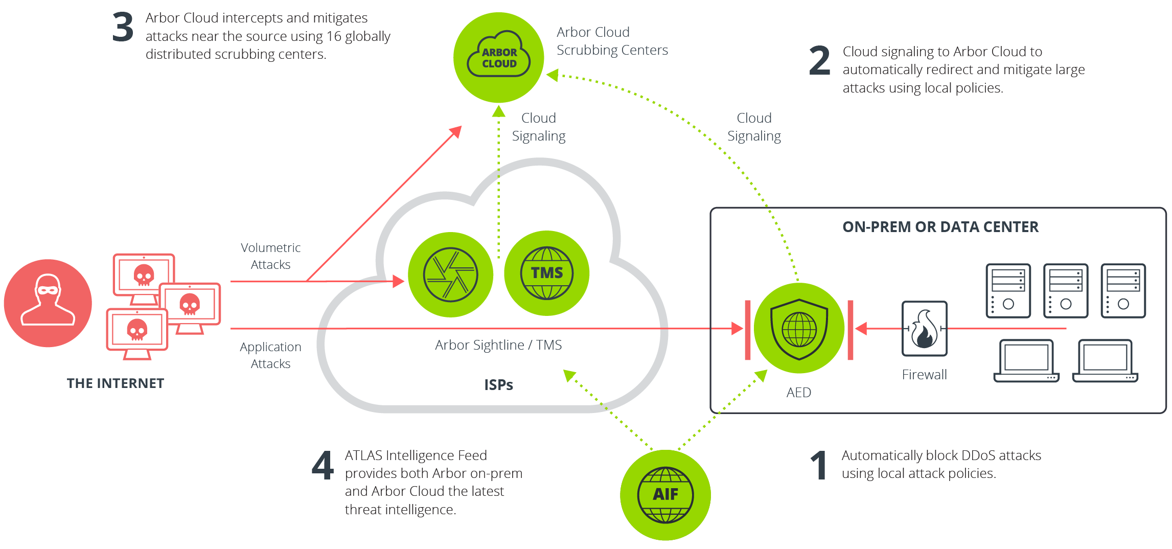 NETSCOUT’s Arbor DDoS mitigation can help organizations prevent most DDoS attacks from being successful. The AI-powered, hybrid, adaptive DDoS protection capabilities within the Arbor suite of products can automatically detect and mitigate most types of DDoS attacks, regardless of size (large or small) and duration (long or short). Arbor solutions are continuously armed with the ATLAS Intelligence Feed (AIF), powered by industry-leading visibility into the world’s internet traffic and with AI to automatically block the latest known DDoS threats.