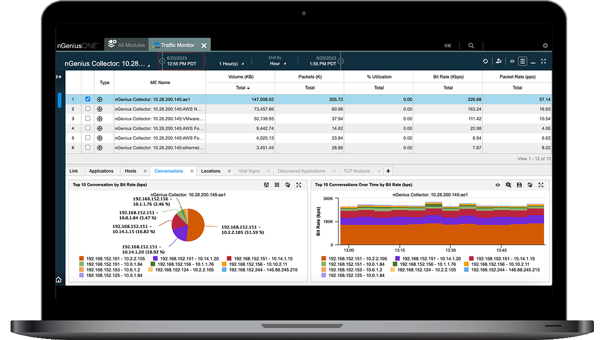 The nGenius for Flows solution analyzes Flow-based data, as well as MIB-II, IP SLA, and IPPING data gathered by nGenius Collector hardware and virtual appliances. Massive amounts of packet based data are turned into actionable insights.