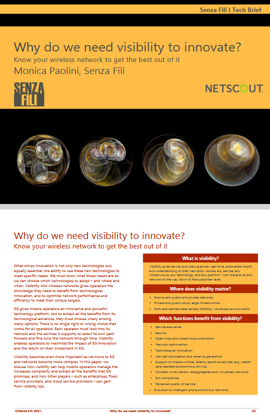 Visibility becomes even more important as we move to 5G and networks become more complex. In this paper, we discuss how visibility can help mobile operators manage the increased complexity and extract all the benefits that 5G promises, and how other players – such as enterprises, fixed service providers, and cloud service providers – can gain from visibility too.